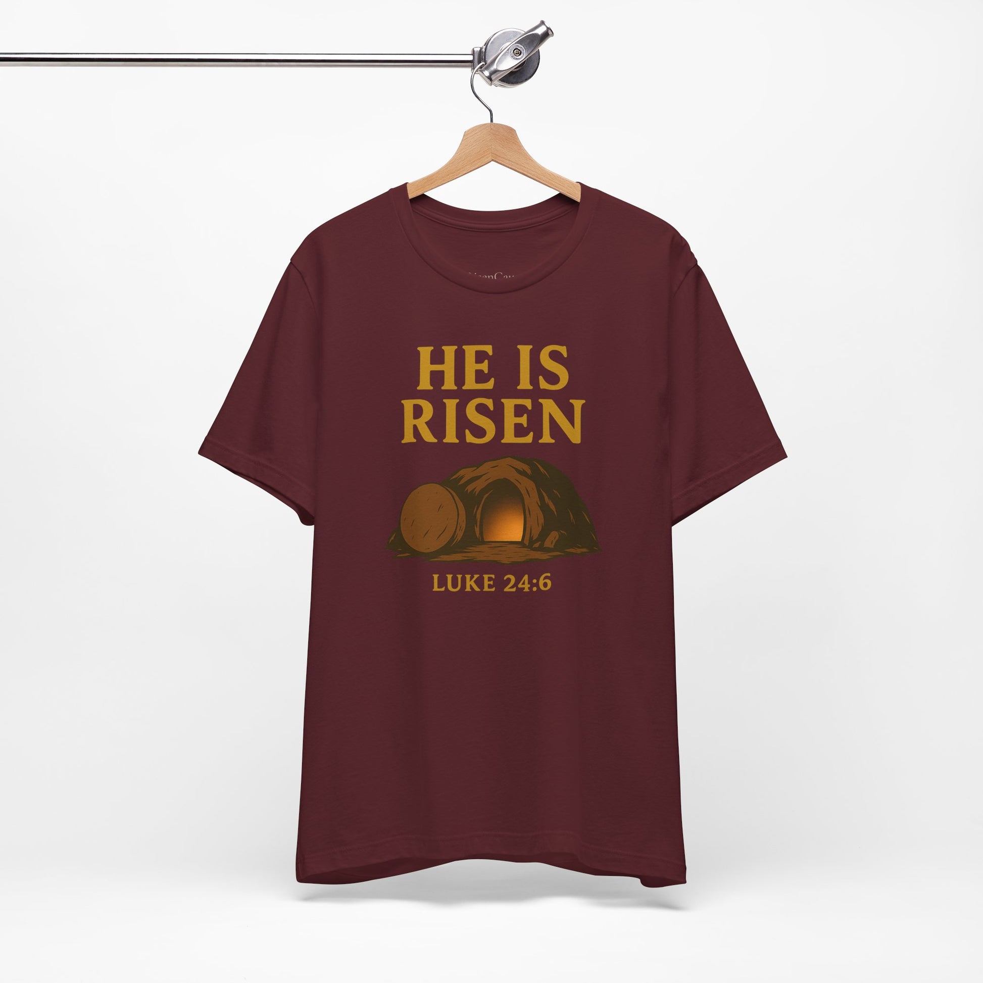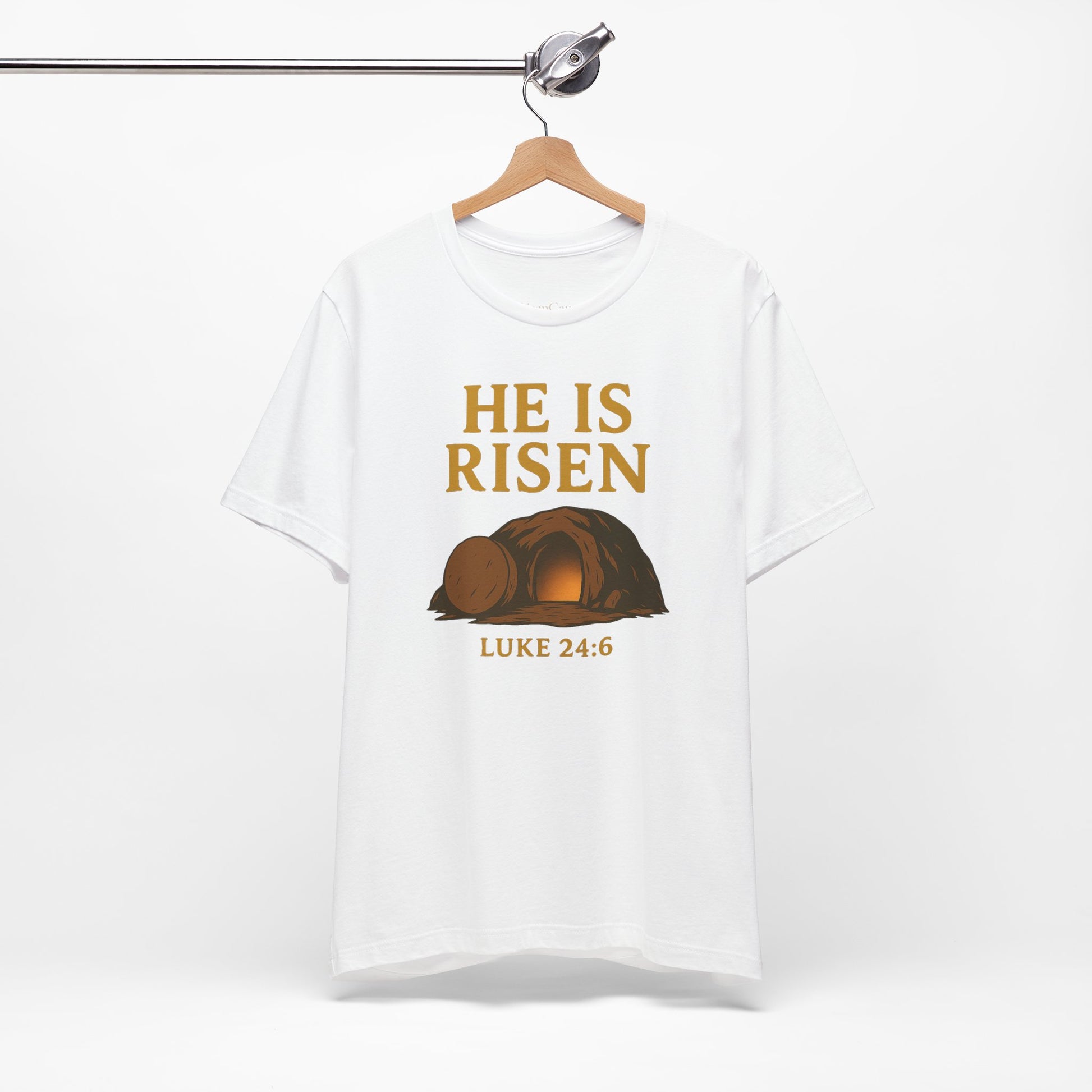 Proclaim the truth of the resurrection with this He Is Risen Christian t-shirt featuring an empty tomb graphic and the Scripture reference Luke 24:6. The clean serif lettering and warm tones make it a powerful yet wearable witness. Crafted from soft, breathable cotton with a classic crew fit, it is comfortable for church, small groups, outreach, or everyday life. Pair it with jeans or joggers and let your clothing point to the hope we have in Christ. A meaningful gift for believers who want to share their faith with clarity and confidence.