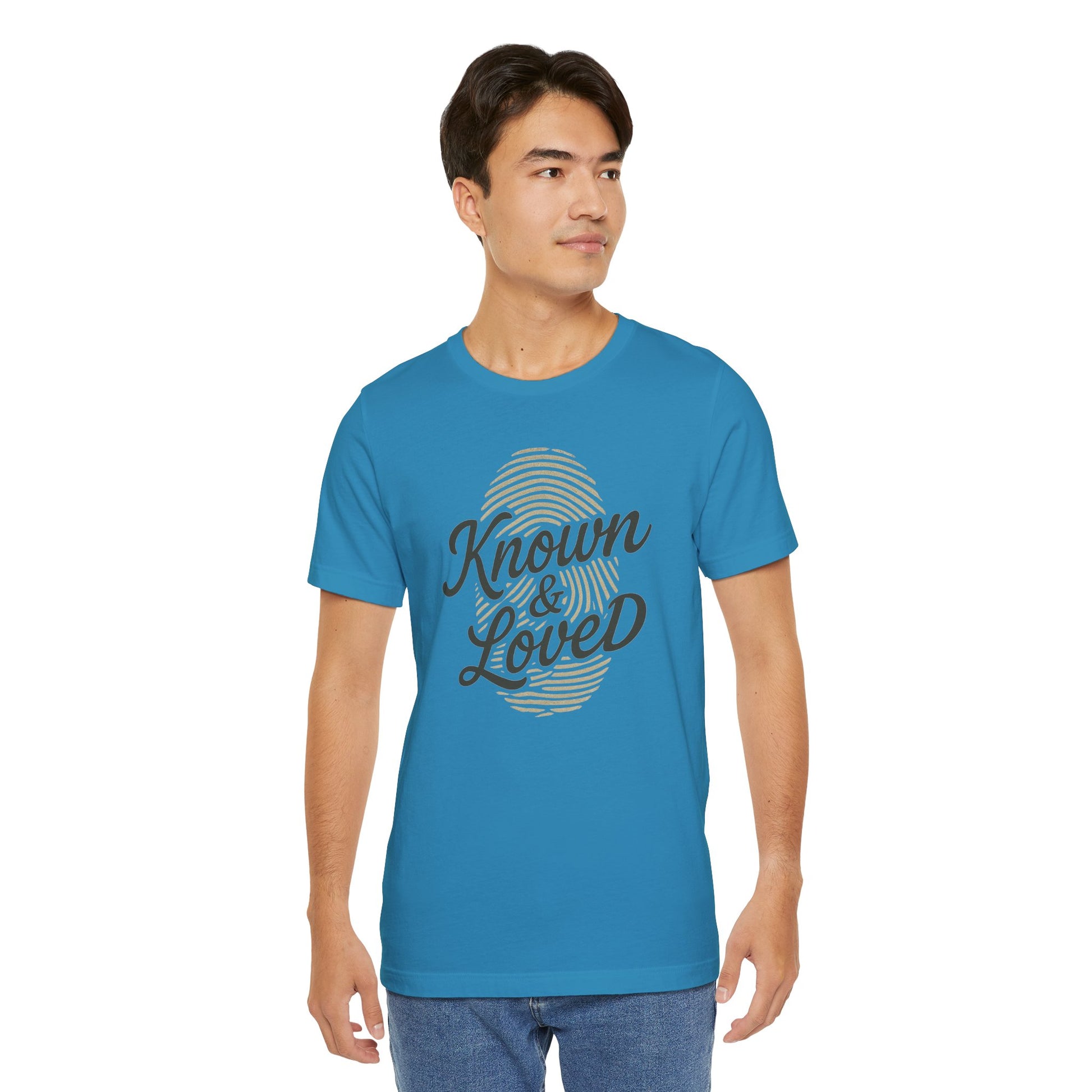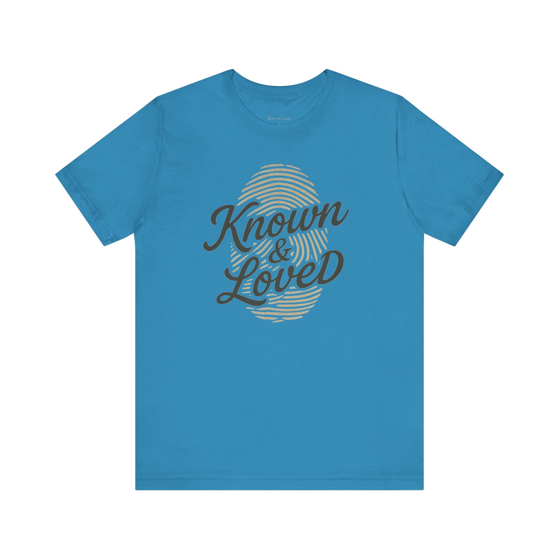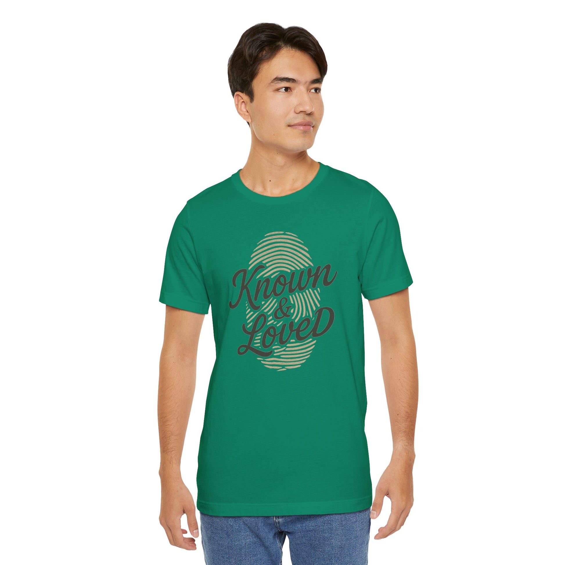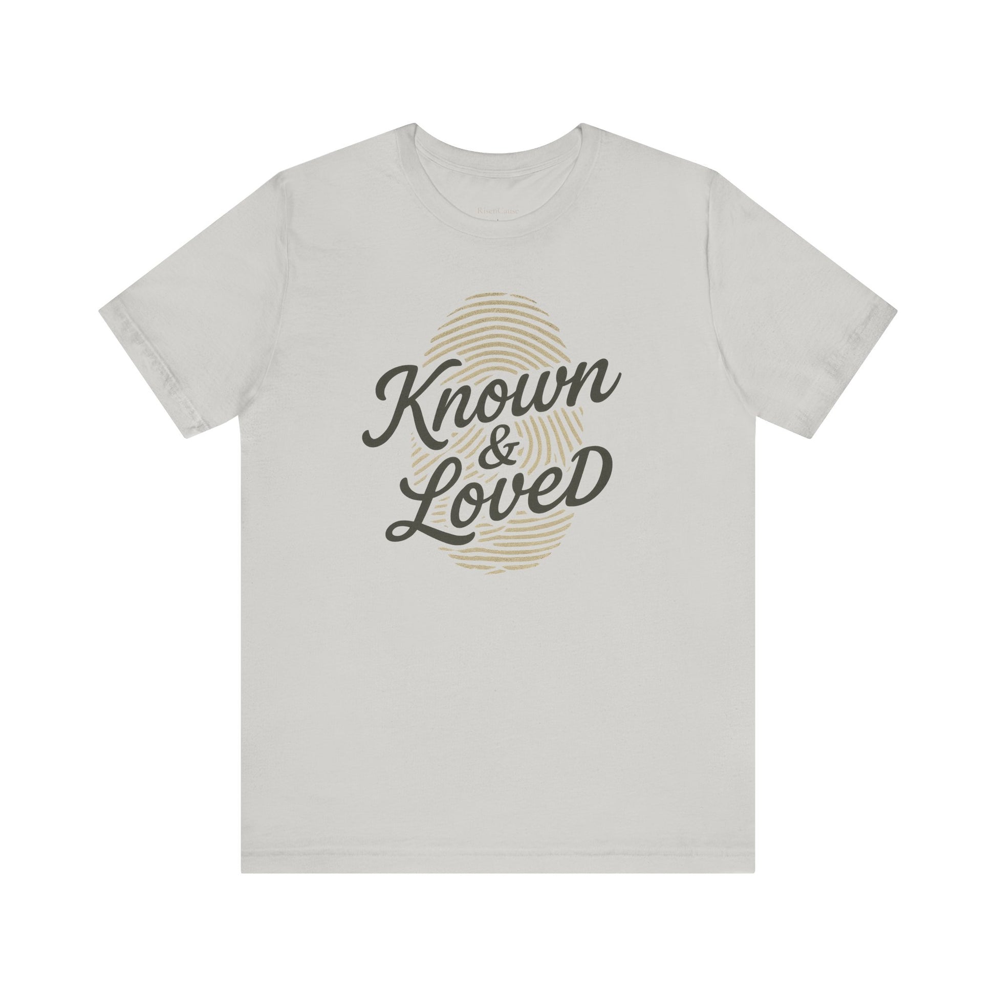 This "Known & Loved" Christian t-shirt shares a timeles truth rooted in God's word. Your identity is not defined by the world, but by your Creator. Featuring a fingerprint graphic, and clean modern typography, this design serves as a bold yet personal reminder of who you are in Christ.
