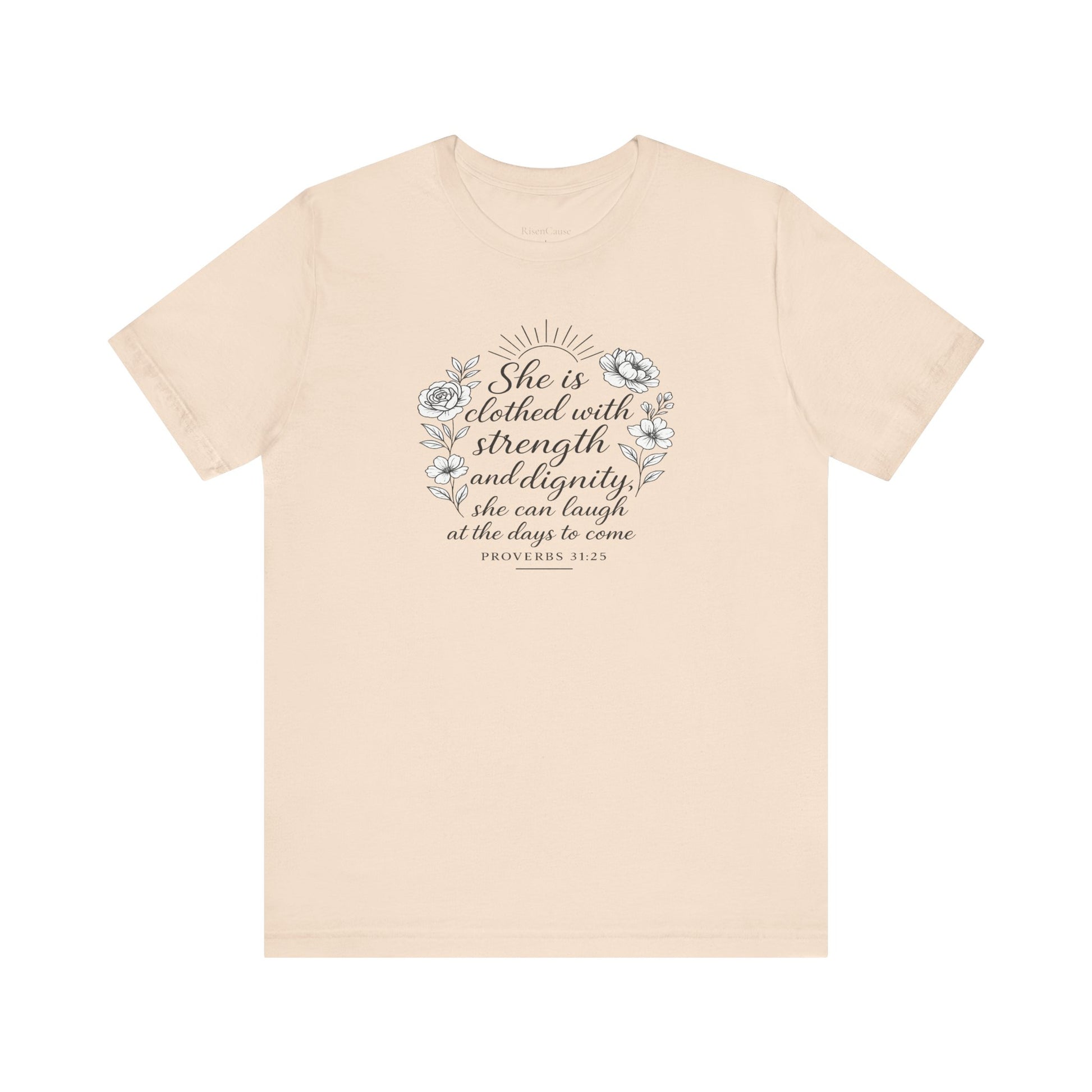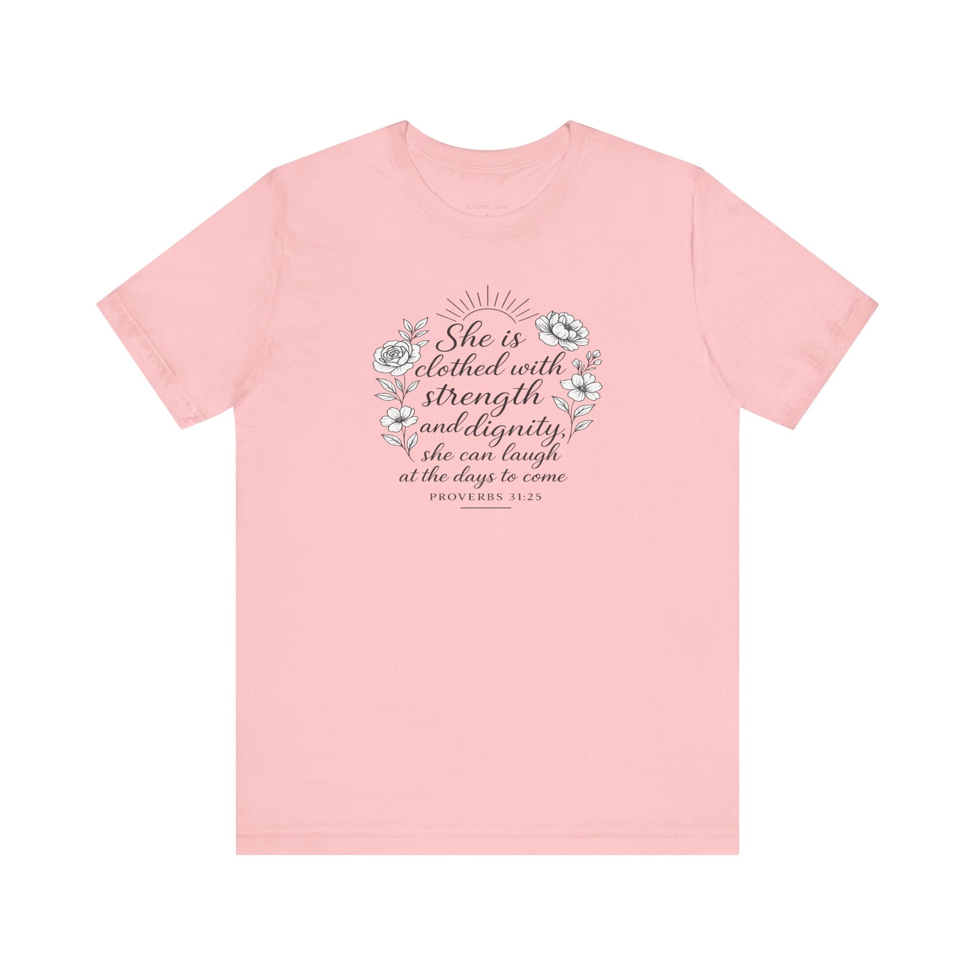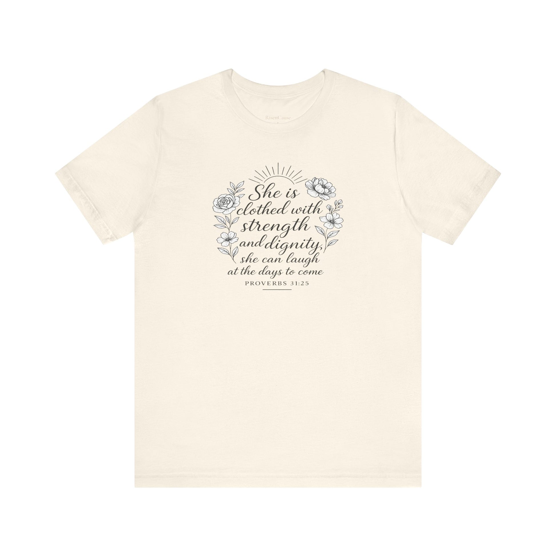 Celebrate godly womanhood with this Proverbs 31:25 Christian t-shirt. The design features elegant script surrounded by soft floral artwork and the verse, “She is clothed with strength and dignity; she can laugh at the days to come.” Crafted from soft, breathable cotton with a classic crew fit, it is easy to wear for church, women’s ministry, small groups, or everyday life.