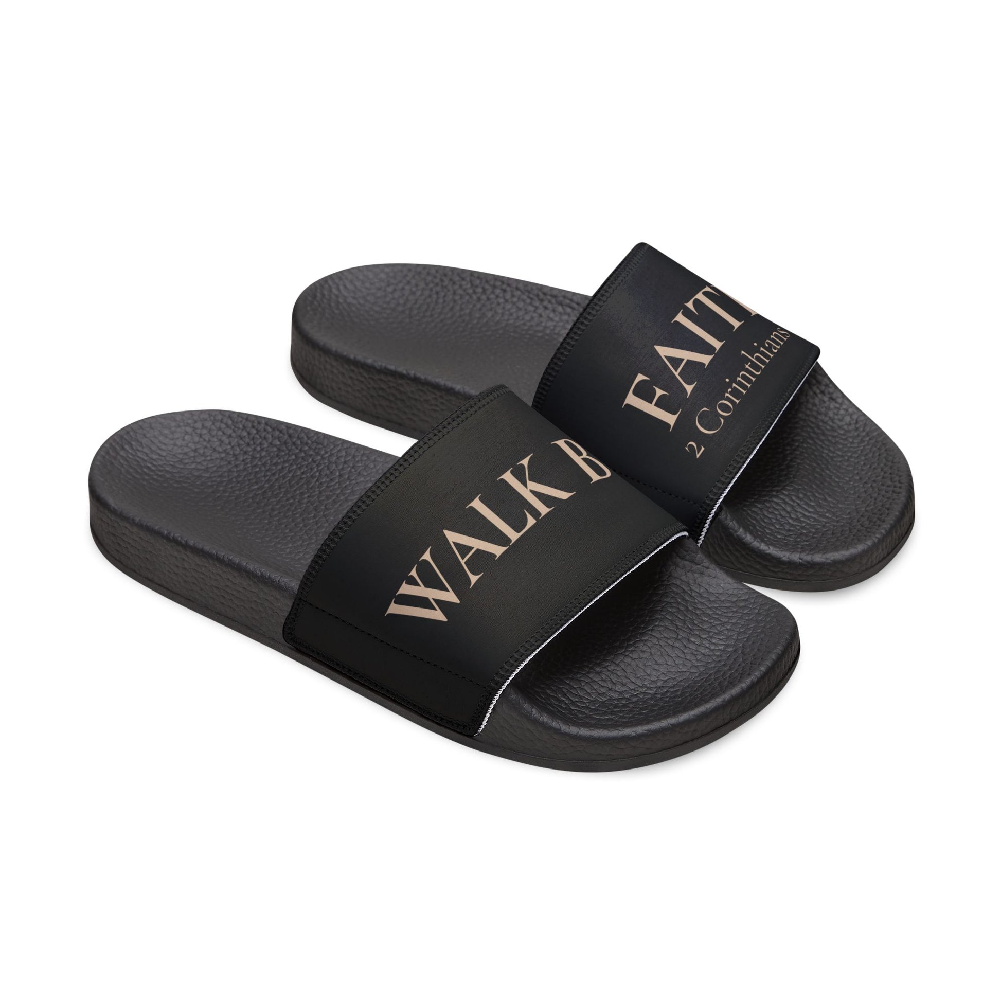 Step out in bold faith with these unisex “Walk by Faith” slides, inspired by 2 Corinthians 5:7. Designed to remind you daily that our journey is guided by trust in God's promises, not by what we see. The minimalist text and timeless black design make them easy to pair with any outfit while keeping your faith front and center.